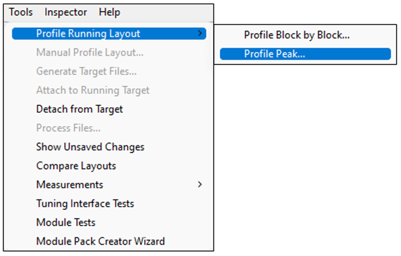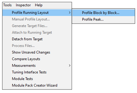 To profile a running .awd in real time, navigate to the ‘Tools > Profiling Running Layout’ menu in the Audio Weaver Designer toolbar while in Tuning Mode: