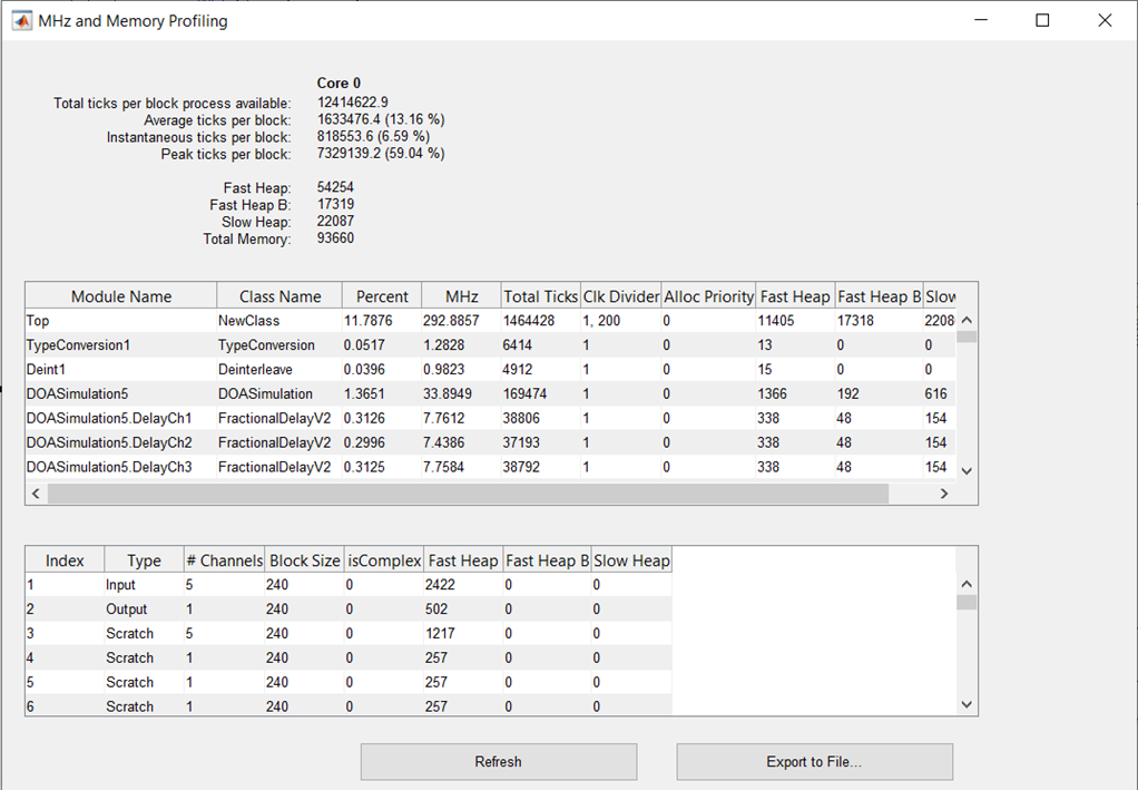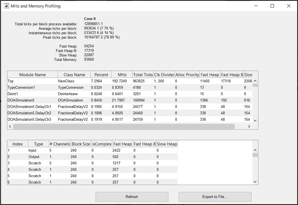 Both the Real Time and Manual Profiling utilities Audio Weaver allow you to export the profiling data to a comma separated value (.csv) file. All three of the profiling windows (Profile Block by Block, Profile Peak, and Manual Profile Layout) have an ‘Export to File’ Button: