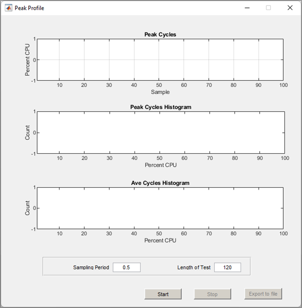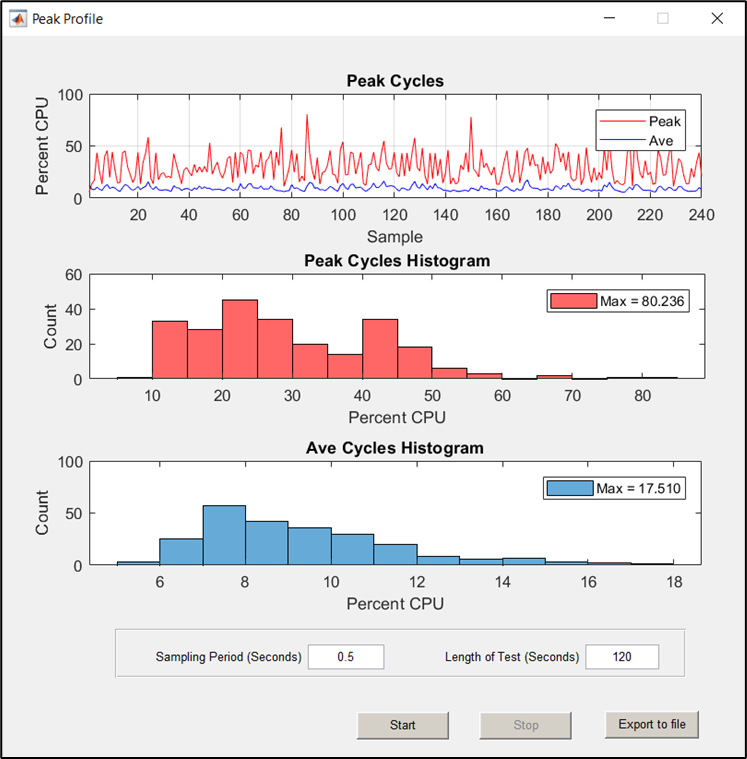 As discussed above, the ‘Sampling Period’ and ‘Length of Test’ fields must be entered in order to run the peak profiling. The time unit for both fields are seconds, and the default values are 0.5s sampling period and 120s length of test. When ready to start the peak profiling, simply click the Start button.