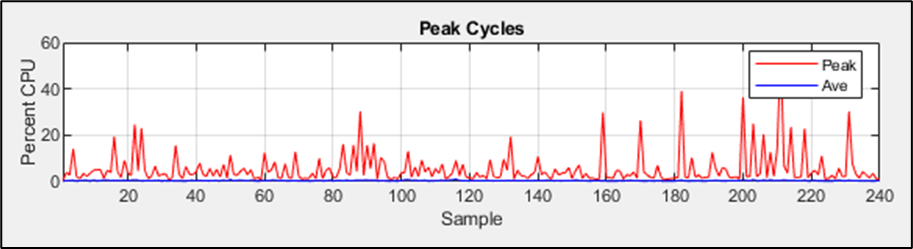 Lastly, the ‘Ave Cycles Histogram’ displays a histogram of average cycle profiling shown in the above ‘Peak Cycles’ graph, where the x-axis is CPU percentage, and the y-axis is cycle count: