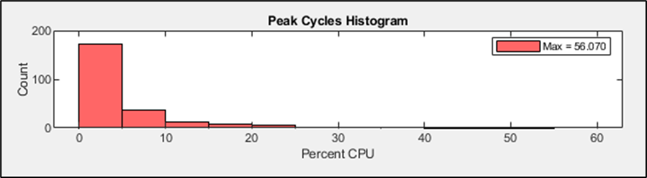 The ‘Peak Cycles Histogram’ displays a histogram of the peak cycles profiling shown in the above ‘Peak Cycles’ graph, where the x-axis is CPU percentage, and the y-axis is cycle count: