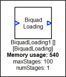 The BiquadLoading Module simulates the loading of biquad filters. This module is used for CPU load testing purposes and implements a large number of cascade Biquad filters. At instantiation time, you specify the maximum number of filter stages that you would like to simulate. Then at run-time you can vary the number of filters running. This makes the CPU work harder. Internally, the module uses the BiquadCascade module to implement the filtering.