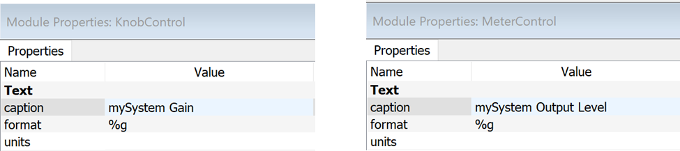 Before testing the dialog, one must attach the control to a module variable. Right click on the meter and knob controls in the Inspector Panel and click View Properties in the pop-up menu. Enter Scaler1.gain in the modVar field, and Meter1.value[0] in the modVar field of the meter. If the names of the modules were changed after placement, enter those names instead of Scaler1 and Meter1: