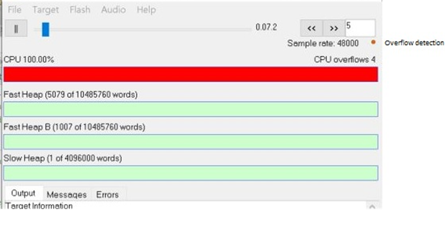 Note: This feature is most accurate in embedded AWE Core targets, but CPU loading and actual number of overflows may not be correct in extreme circumstances; highly buffered applications with spiky CPU usage for example. CPU overflows on the Native target will be least accurate because of thread / CPU interaction outside of the control of AWE Server. Using CPU affinity to increase the accuracy of this feature for AWE Core OS targets is described in https://documentation.dspconcepts.com/awe-designer/latest-version/profiling-in-audio-weaver-tips-and-tricks.