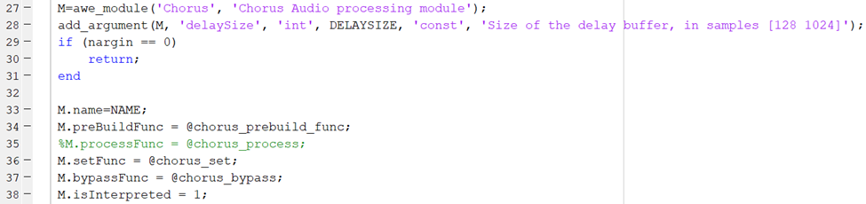 NOTE: Confirm there is a corresponding .m file for any function being defined, otherwise comment out the definition. For example, this module was failing because there was no corresponding “chorus_process.m” file. Commenting out line 35 fixed the issue.