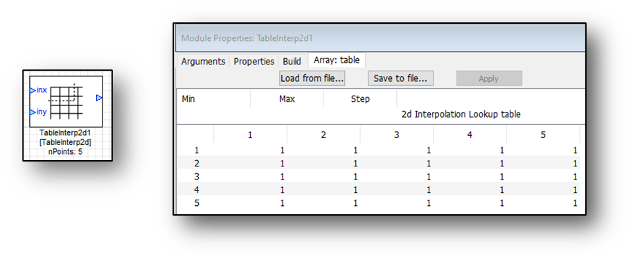 Table Interp2d takes in a vector input (x and y pins) and scales them according to the nPoints length matrix. It uses bilinear interpolation of the table values at the four neighboring points (above, below, left, right).