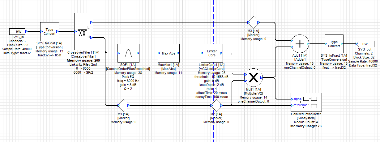 A GainReductionMeter subsystem has been added which lets you visualize the action of the limiter circuit. This is optional and can be eliminated after system tuning.