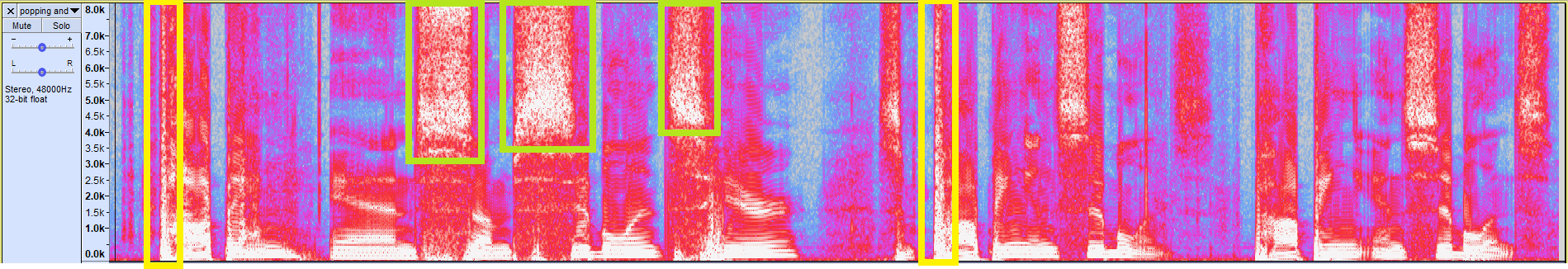 Another problem with microphones is that if the talker is too close then every plosive (a consonant with a puff of air like a “p”) causes a mini explosion. This also occurs with fixed microphones if the speaker bangs their hand on the podium or taps on the microphone enclosure. A spectrogram of a WAV file containing pops (the word “popping”) is shown below (yellow outline). A pop is characterized by a quick broad blast of energy across the spectrum. Compare that to sibilance (light green outline) which contains mostly energy above 4 kHz.