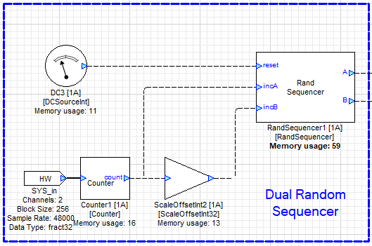 Internal variables IndexA and IndexB are incremented by the incA and incB inputs, respectively. The individual indices are used to read the entry from the corresponding sequence and present it at the corresponding output. When either index is incremented from (seqLength/2 - 1), IndexA and IndexB are both reset to 0 and the random vector is regenerated.