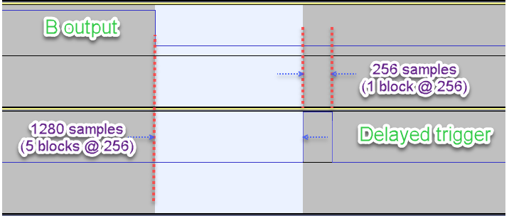 This will create a trigger pulse that is 1 block in length (due to the Block Size being 1 sample and the delay setting also equal to one sample). The Block Time is set by the input pin, which is 256 samples (Block Size) / 48000 (Sample Rate) = 5.333 milliseconds. This corresponds to a Block Frequency of 187.5 Hz.
