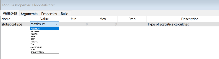 The variable for BlockStatistics module is statisticsType which specifies which statistic is computed: 0=maximum, 1=minimum, 2=maximum absolute value, 3=mean, 4=RMS, 5=standard deviation, 6=variance, 7=average energy, 8=sum, 9=sum of squares. The statistics are computed on a block-by-block basis and stored in the instantaneousValue variable.