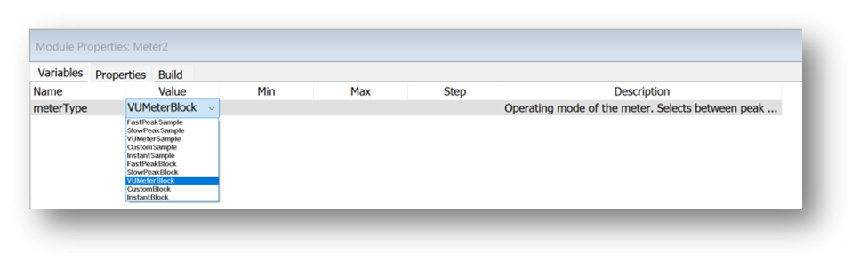 Right click on the module, go to properties, and switch tabs to get to variables. Operation modes of the meter selects between Peak and RMS calculations under variable ‘meterType’.