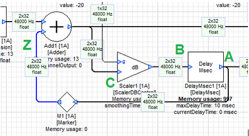 A feedback path introduces a single sample of latency to that path. The reason for this is that the value of the signal on a feedback path is saved during one sample period and used during the next sample period. Refer to Figure 16 above. Since output A of the DelayMsec module which drives the feedback wire Z depends on its input B which depends on C which depends on Z, this signal cannot be calculated in a single cycle. Marking a wire as “Feedback” adds a single sample buffer. The signal on the highlighted Feedback wire was calculated on the previous cycle compared to everything else.