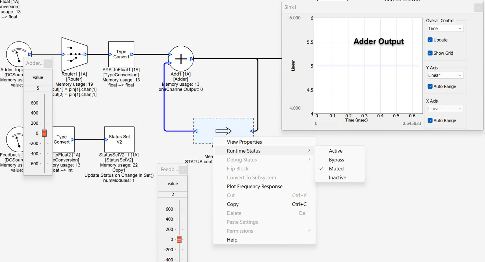 The feedback wire along with the Copier module can be used to control the status of the feedback loop. In the example shown below; the output of the adder is fed back into the second input of the adder via a feedback loop. To control the status of the feedback loop we have added a Copier module before the feedback wire. The status of the feedback wire is being controlled byStatus Set Module which in turn gets the input from Feedback_DC.