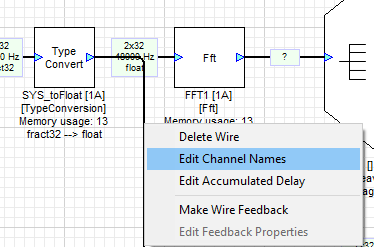 The number of channels and block size of a wire is called its size. Show wire properties using the View→Wire Info menu item. When enabled, you will see the details of each wire displayed as shown below. The sample rate and data type are also shown.