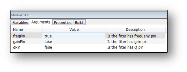 Parameters which aren’t specified by input pins are specified via the variables and properties tab. The SOFControl module uses deferred processing to compute the filter coefficients. That is, the design equation is not executed every block. Rather, when the control data on the input pin changes, the module sets a bit in its instance structure which causes the design function to be called from non-real-time code. This reduces the peak CPU load at the expense of having a slower update rate. In typical applications, the module will update every few 10s of milliseconds. If updating needs to happen more quickly, then use the FOFControl module or the ParamSet module coupled with a SecondOrderFilterSmoothed module.