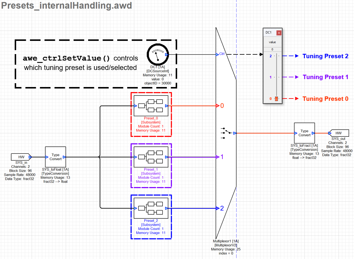 At a high level, we’ll consider two distinct approaches for Audio Weaver tuning preset implementation: 'Internal Handling' & 'External Handling'. These two preset categorizations describe whether different audio tuning presets are implemented within a single AWD/AWB file (Internal Handling) or multiple AWD/AWB files (External Handling).