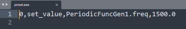 CODEawe_diary('on', 'preset.aws');In the design, make changes to the parameters you wish to change. In this example the design “HW_Button_Mute.awd is used from the Control Interface and Debugging app note here: Control Interface Usage and Debugging and the change made was in the PeriodicFuncGen1 module on the “freq” parameter (from 1000 to 1500Hz):