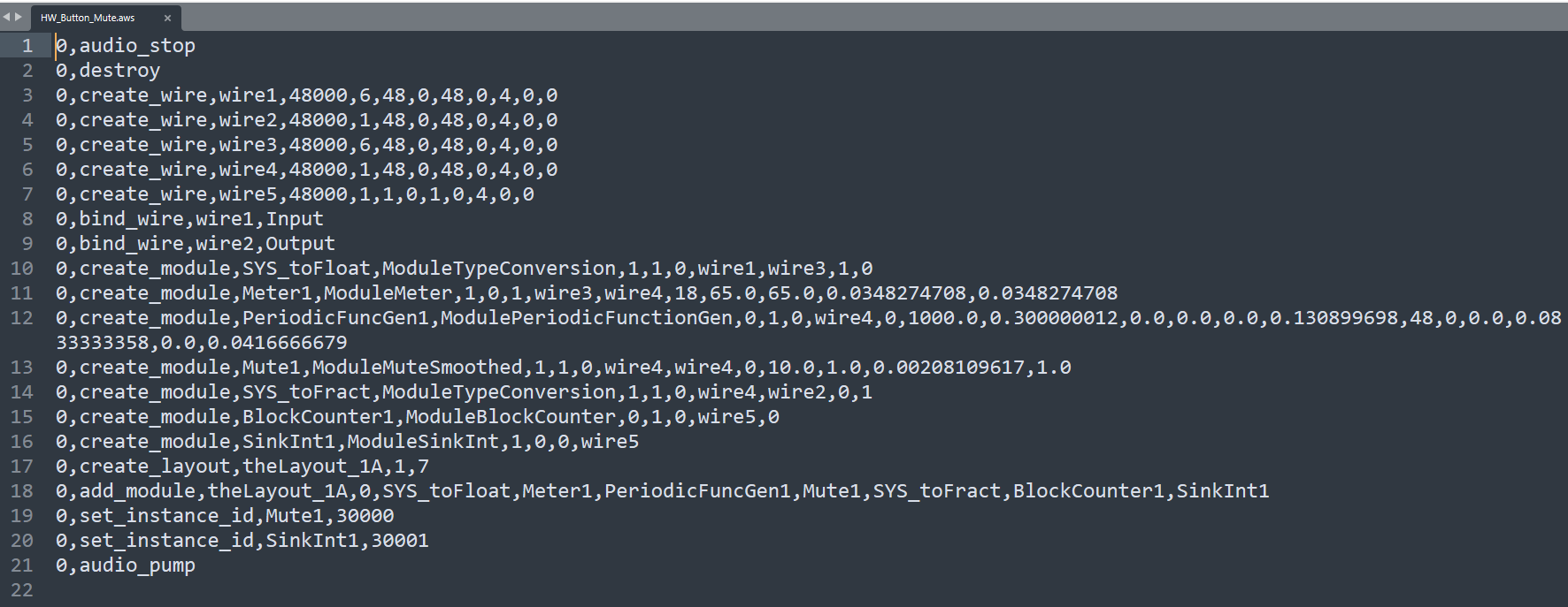 When a design is exported as an .awb file for an embedded target, “loadAWBfromArray()” is called from the BSP code. This binary file contains the signal flow information, such as modules, wires, and parameters used in the design. In some cases, an entire .awb signal flow could be treated as a “preset” whereas an entirely new layout is called from the BSP. The following section will cover a method where the only thing that needs changing are the parameters and therefore a “partial” .awb can be loaded.