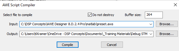 9. Select the preset.aws source file and destination for an .awb in the AWE Script Compiler Window:
