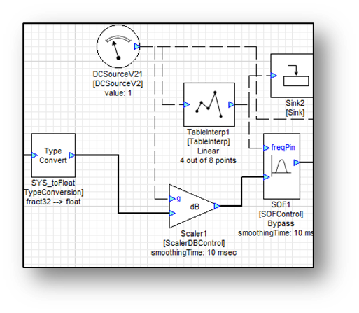 The SOFControl module allows for a control signal to adjust parameters (frequency, gain, or Q) of a second order filter. The control parameter(s) are selected in the module’s module properties. In this case, only the gain is controlled as shown below: