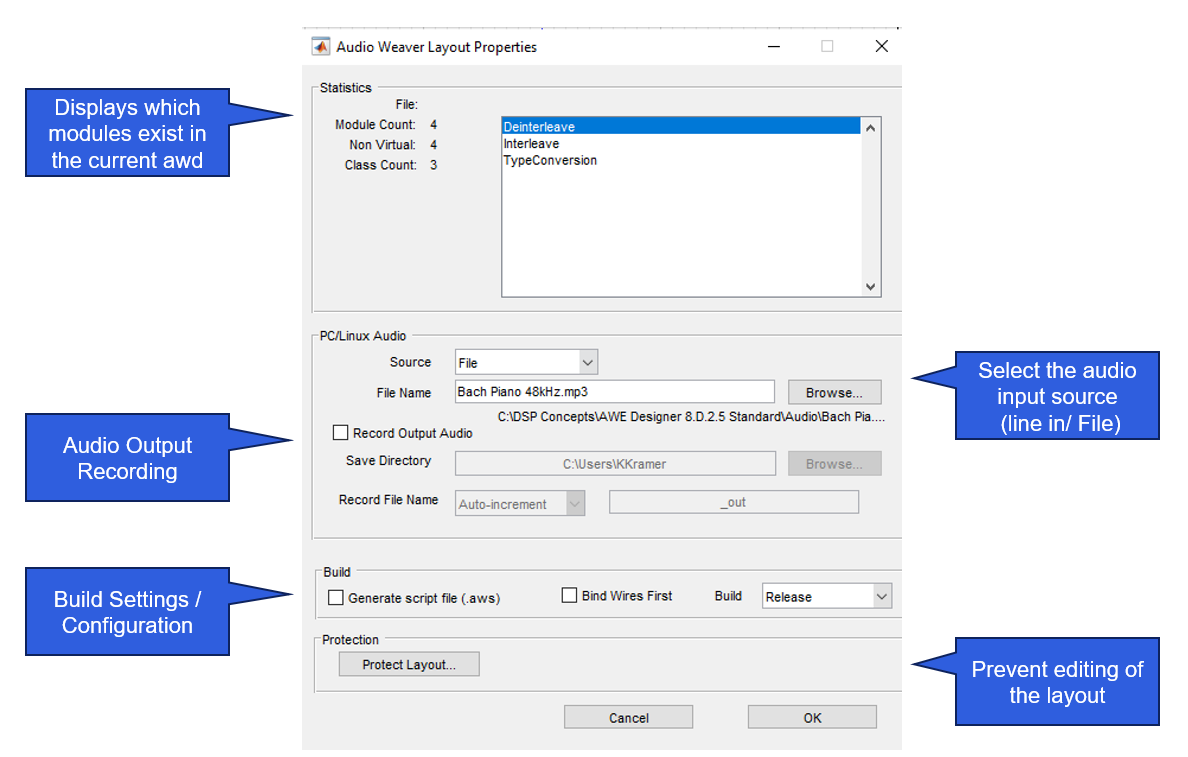 The layout properties dialog provides information about your layout and along with some control over how the layout behaves. To edit your layout’s properties, navigate to ‘Layout → Layout Properties’ from the top banner of Audio Weaver.