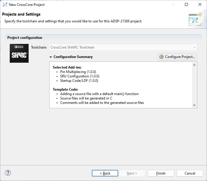 Click ‘Next’ and choose the appropriate SHARC DSP you’re using in the next prompt. In this case, we select SHARC ADSP-21569: