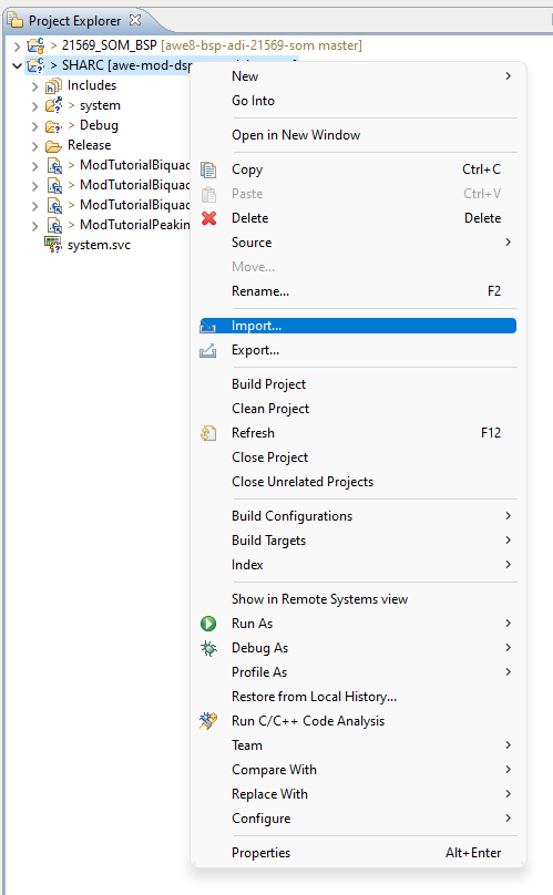 Right click on the ‘SHARC’ project in the Project Explorer tab on the left hand side of the CCES IDE window, and select to ‘Import’ from the context window: