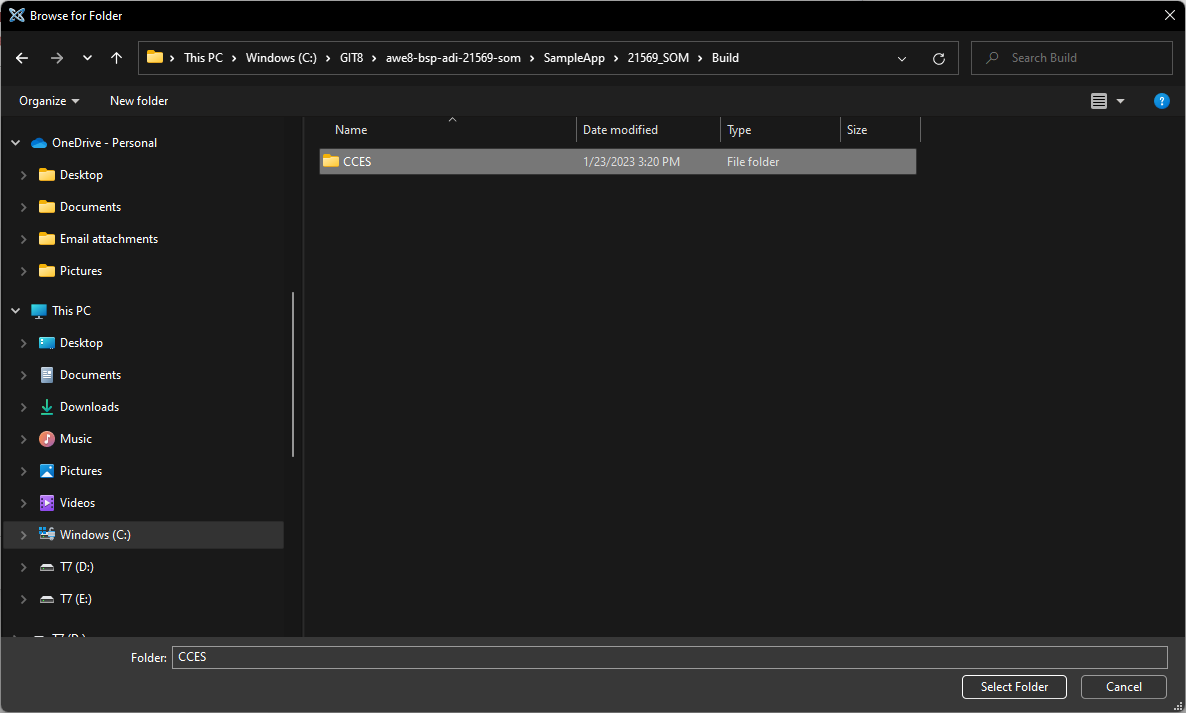 The ADI-21569-SOM BSP should be located in the ‘<DIR>\awe8-bsp-adi-21569-som\SampleApp\21569_SOM\Build\CCES’ folder. Select the ‘CCES’ folder: