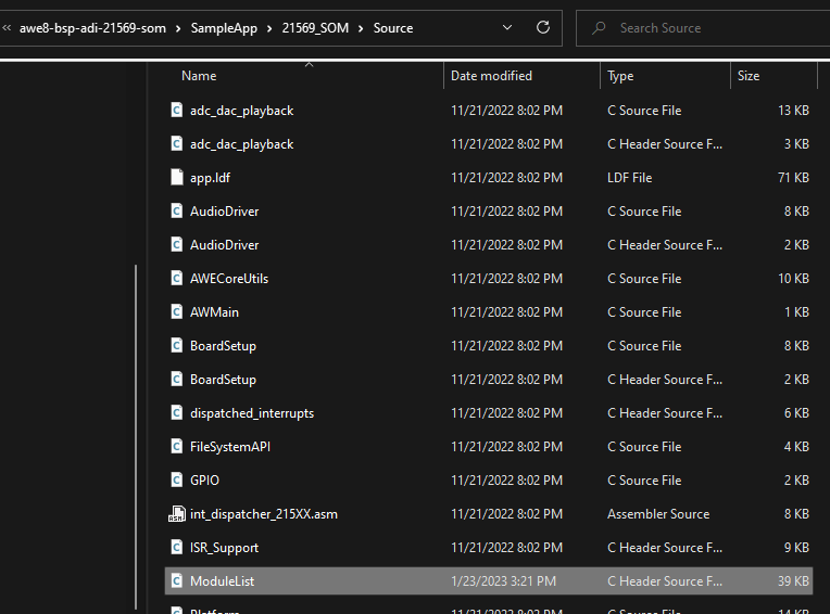 Navigate to the ‘<DIR>/awe8-bsp-adi-21569-som/SampleApp/21569_SOM/Source’ folder and open ModuleList.h for editing: