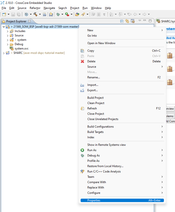To remedy this, right click on the ‘21569_SOM_BSP’ in the CCES IDE Project Explorer, and select ‘Properties’ from the context menu: