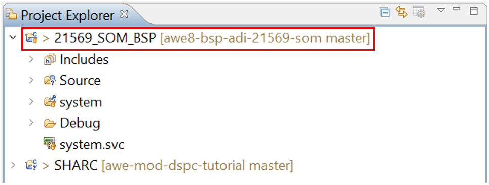 You should now see the ‘21569_SOM_BSP’ in the Project Explorer in the left hand side of the CCES IDE window: