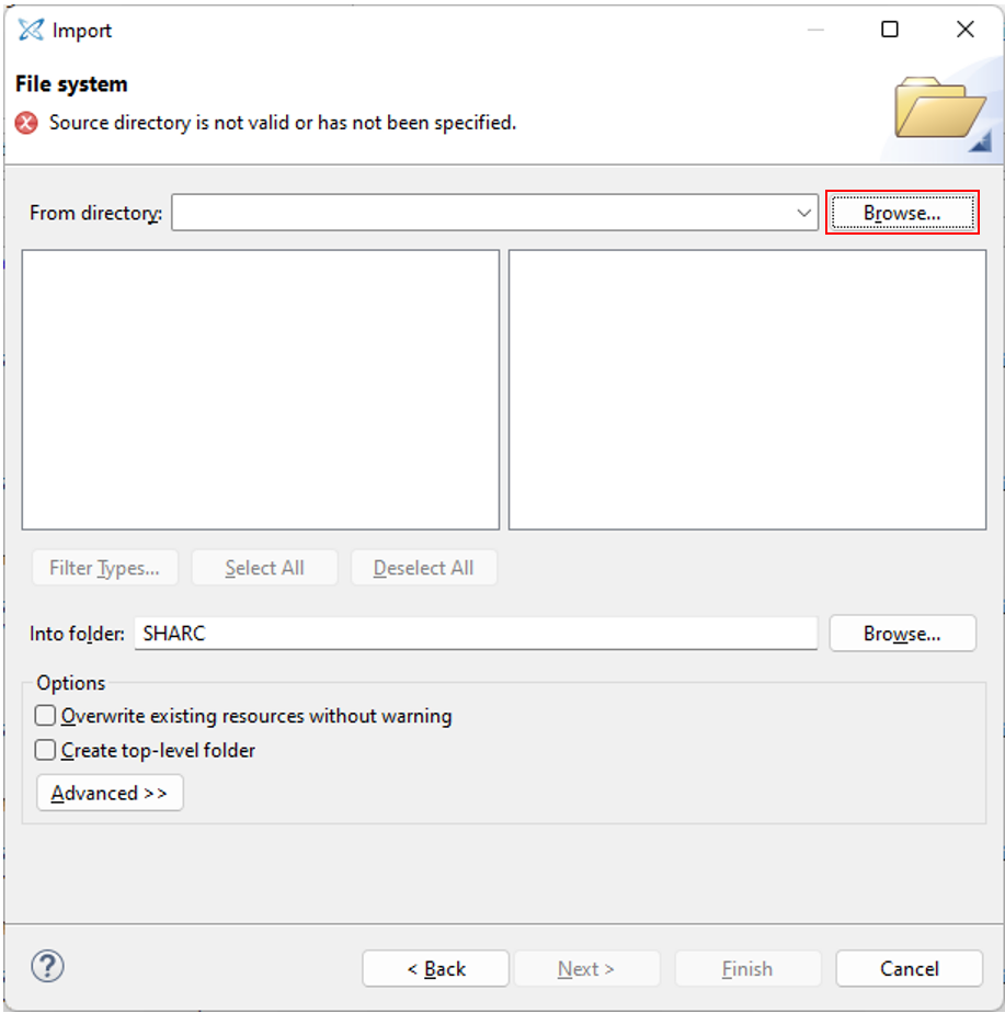 Select the ‘Browse’ button to locate the ADI-21569-SOM BSP Project directory: