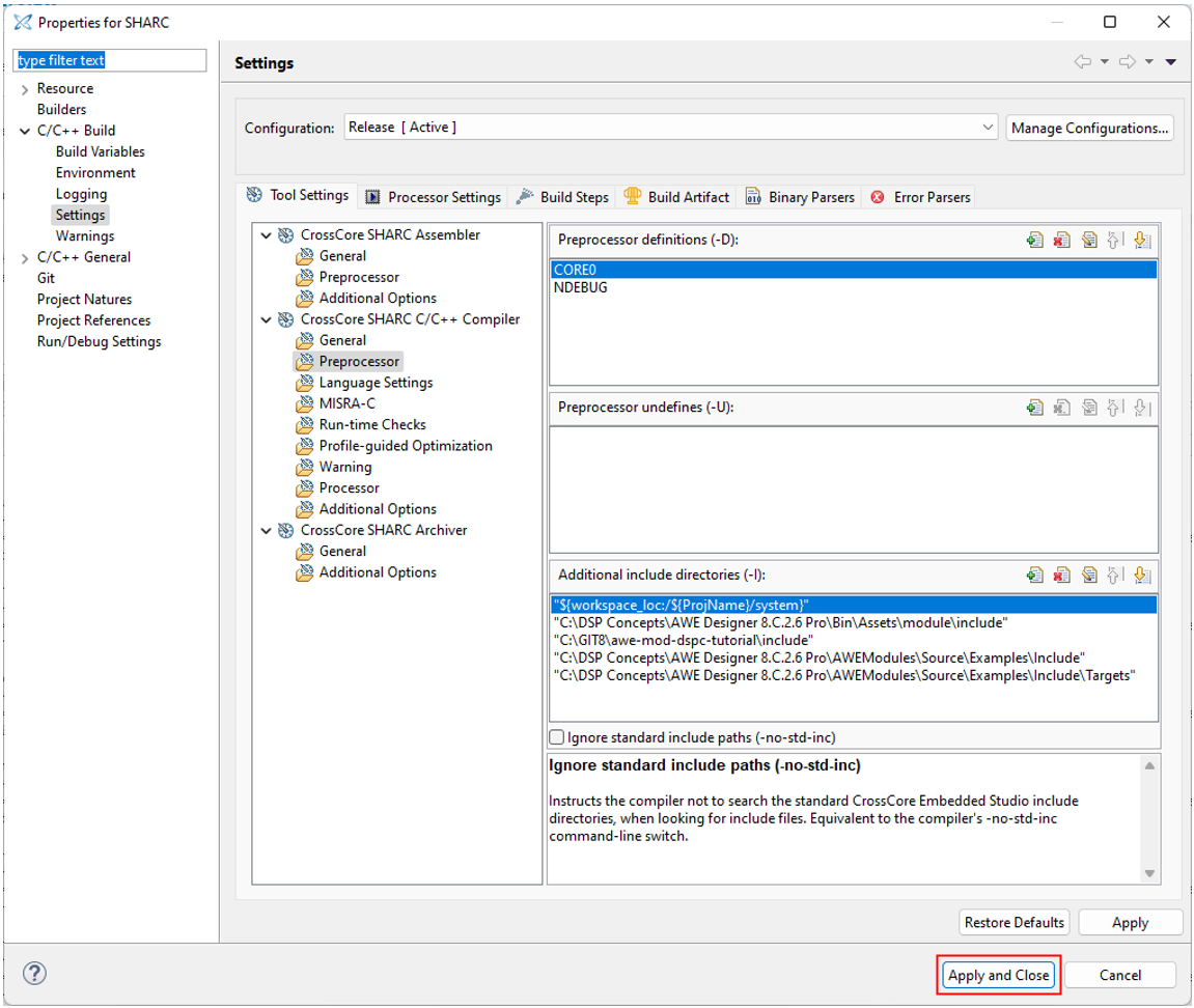 Navigate to ‘C/C++ Build > Settings’ for the Release Build Configuration, and in the ‘Tool Settings’ Properties tab, add the following paths to the ‘Additional include directories’: