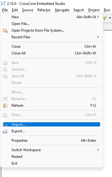 From the top CCES IDE menu bar, select ‘File > Import’: