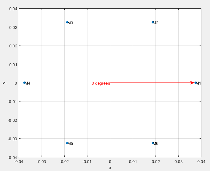 The expected delay as a function of angles of arrival for a microphone pair is precomputed based on the microphone geometry. We will refer to this function as Taus(theta). For example, given the microphone geometry below: