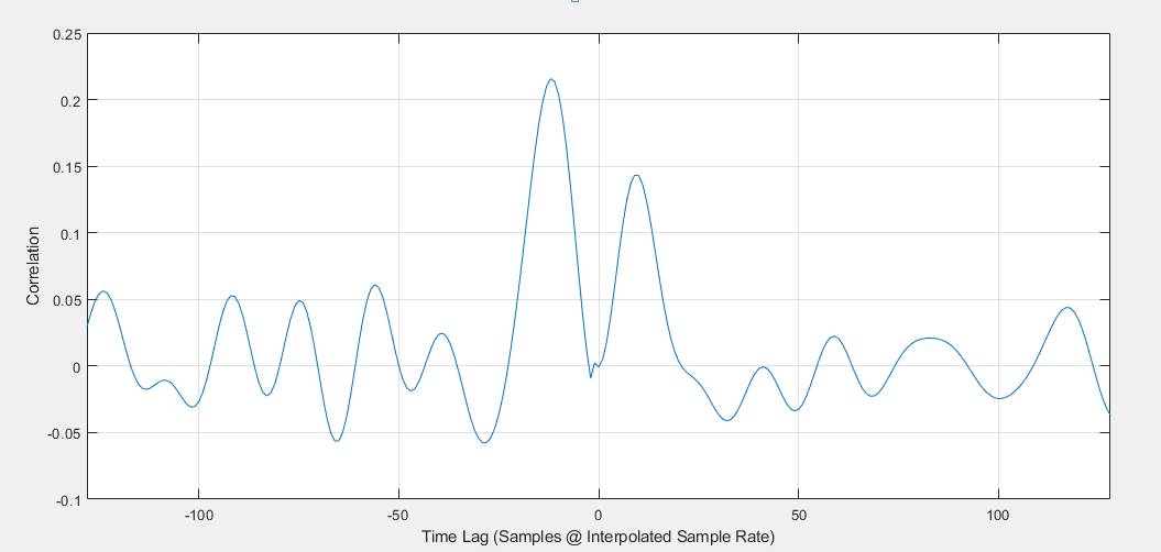 To solve this, interpolation between the samples are needed. If a more reasonable range, say 49 discrete values, is desired, then time-delay should be upsampled by a factor of 8. The most efficient way to upsample is by zero-padding the GCC-PHAT coefficients before the IFFT operation. To upsample by 8, the original GCC-PHAT coefficient should be zero-padded with 7x its original length. An IFFT operation is then performed on this zero-padded GCC-PHAT coefficients so that in the time-delay signal is now at a higher sample rate than the original. If the original sample rate is 16kHz and the interpolation factor is 8, then the time-delay signal is now at 128kHz. Each sample in this now represents ~8 μs or 2.7 mm, giving a much higher resolution.