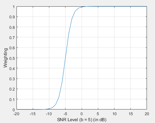Essentially, the weighting function is a sigmoid function based on the level difference between the microphone and the measured microphone noise floor (pseudo-SNR estimation). The user tunable b value shifts the sigmoid to the left or to the right.