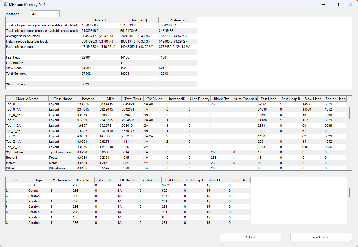 For multi-instance architectures, every Audio Weaver profiling utility enables users to export either profiling data for all instances or individual profiling data for a selected Audio Weaver instance: