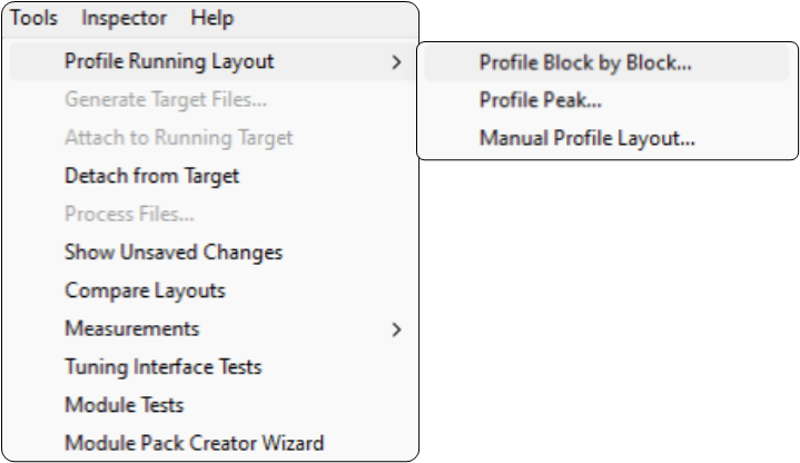 To profile a running .awd in real time, navigate to the ‘Tools > Profiling Running Layout’ menu in the Audio Weaver Designer toolbar while in Tuning Mode: