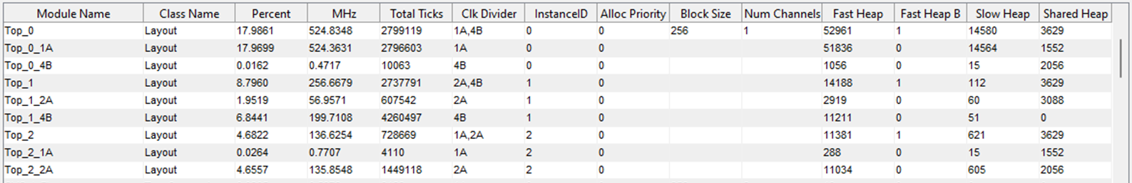 The ‘Top_0’ Module Name line item contains profiling information for the entire .awd layout’s processing. In a multi-instance architecture, aggregate profiling information for each discrete Audio Weaver instance is labeled as ‘Top_<AWE Instance #>’. If the .awd utilizes multiple audio processing threads, aggregate profiling information for each discrete thread is labeled as ‘Top_<AWE Instance #>_<Thread ID>’: