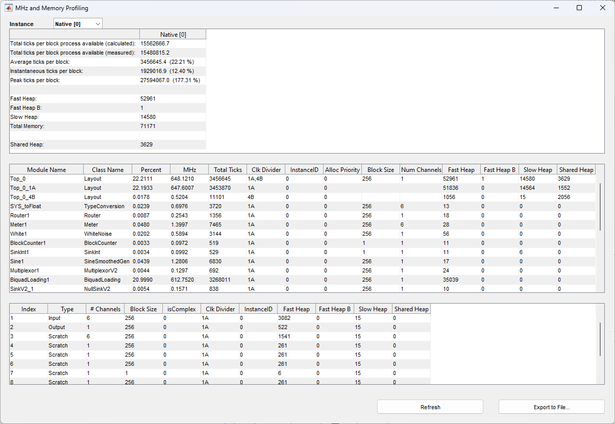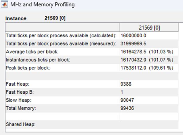 When selecting the ‘Profile Block by Block’ real time profiling option, Audio Weaver will run complete MHz and Memory profiling on the entire audio system signal flow (.awd) and display the profiling information in a pop-up window. The ‘Tick’ mentioned here is the time measured in terms of CPU clock cycles. It can be measured as Tick = (1/CPU Clock Frequency). MHz is the Million Instructions Per Second (MIPS) of the system.