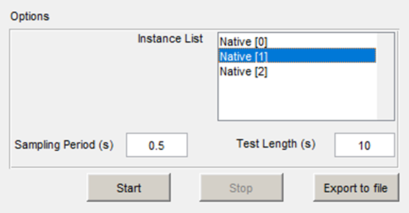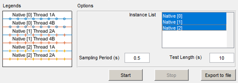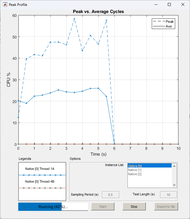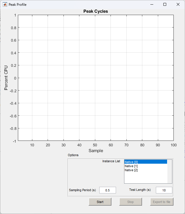 As discussed above, the ‘Sampling Period’ and ‘Test Length’ fields must be entered in order to run the peak profiling. The time unit for both fields are seconds, and the default values are 0.5s sampling period and 10s test length. When ready to start the peak profiling, simply click the ‘Start’ button.