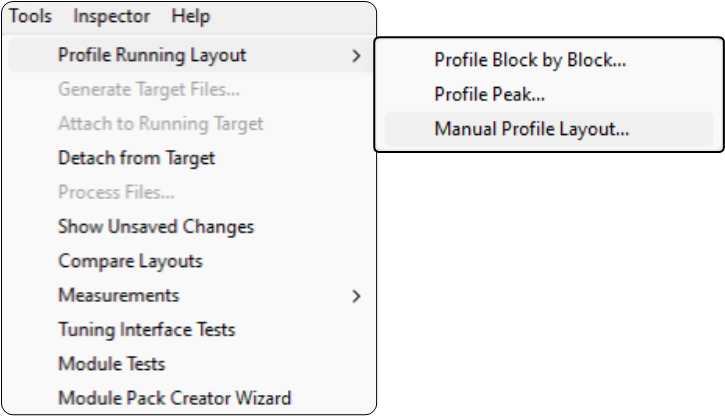 To Manual Profile an .awd layout, navigate to ‘Tools > Profile Running Layout > Manual Profile Layout’ in the Audio Weaver Designer toolbar while in Tuning Mode: