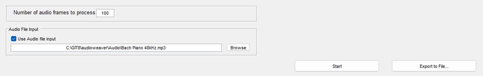 At the bottom of the Non-RT MHz and Memory Profiling pop-up window, set the Number of audio frames (blocks) to process and an audio file to be used as input audio data: