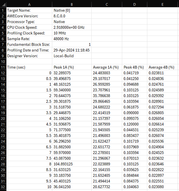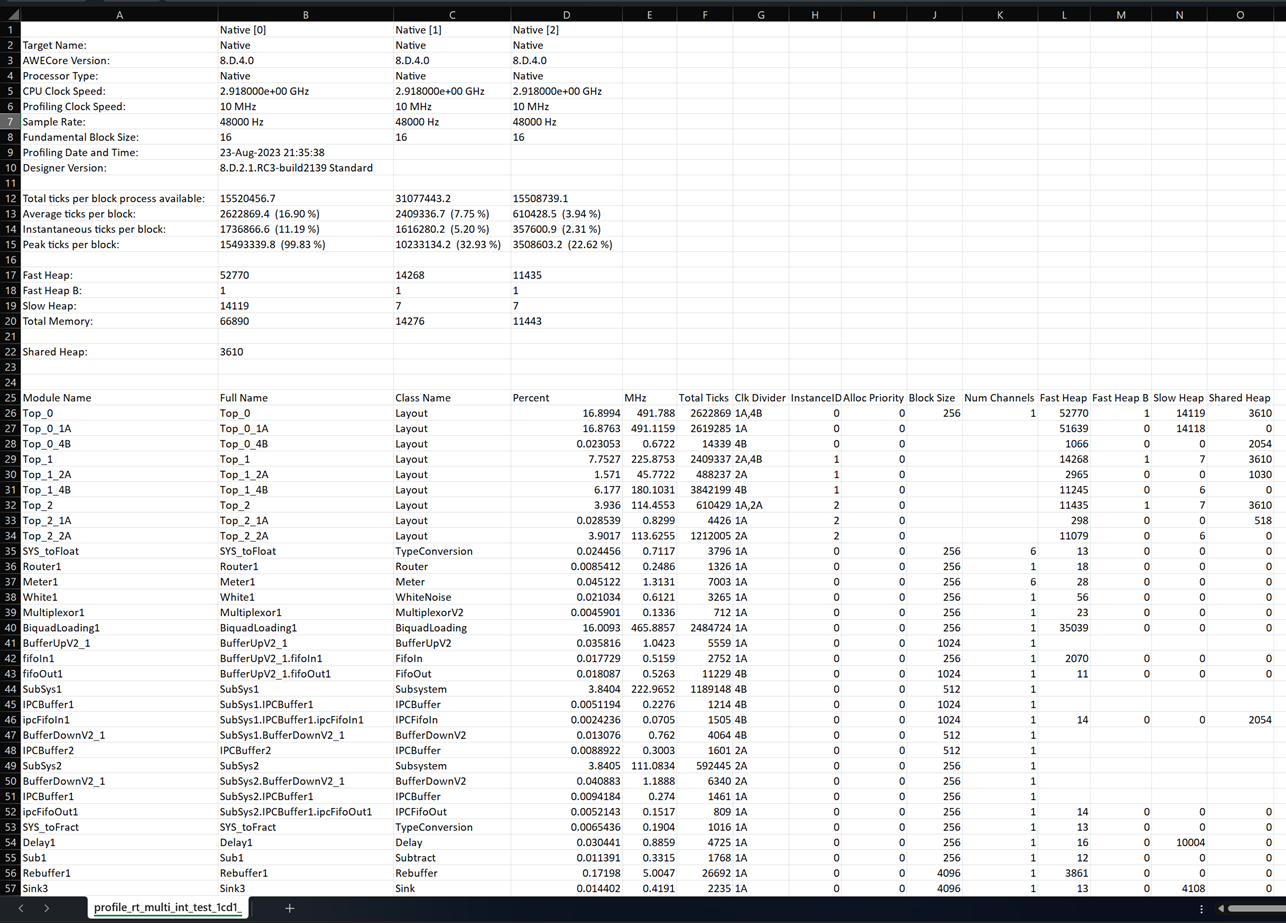 The exported block by block and manual profiling .csv files are structured identically to their pop-up windows in Audio Weaver: