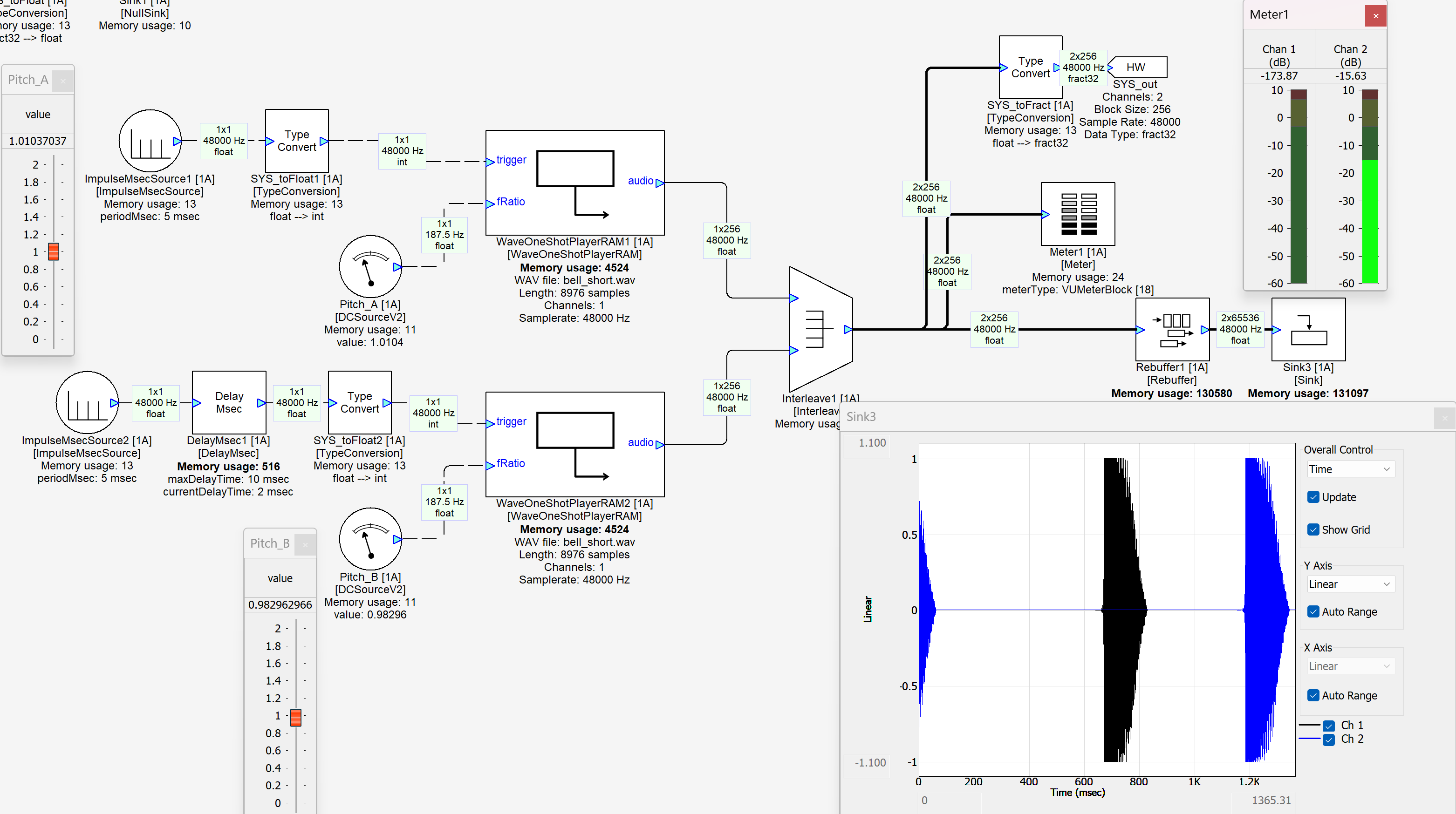 The RAM module starts playback of a wave file provided by the user which is stored as a buffer array. The example below describes the workings of a wave one shot player RAM module. In this example we are taking two RAM modules and have stored two short wav files. The two RAM modules are working alternatively in a Ping-Pong manner. DC sources named PitchA and PitchB are used to vary the pitch of RAM1 and RAM2 respectively. In this example we are using an Impulse source for both the wave modules as a trigger to start playback of the wave files respectively. RAM2 has been given a delay of 2 msec which in turn creates the Ping Pong effect. The wav file used here is a Bell sound.