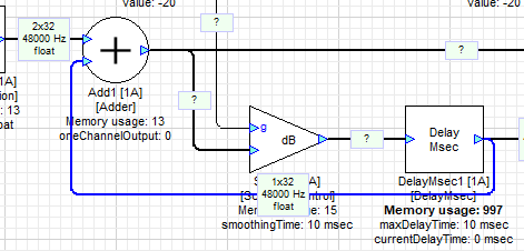 A feedback path introduces a single sample of latency to that path. The reason for this is that the value of the signal on a feedback path is saved during one sample period and used during the next sample period. Refer to Figure 16 above. Since output A of the DelayMsec module which drives the feedback wire Z depends on its input B which depends on C which depends on Z, this signal cannot be calculated in a single cycle. Marking a wire as “Feedback” adds a single sample buffer. The signal on the highlighted Feedback wire was calculated on the previous cycle compared to everything else.