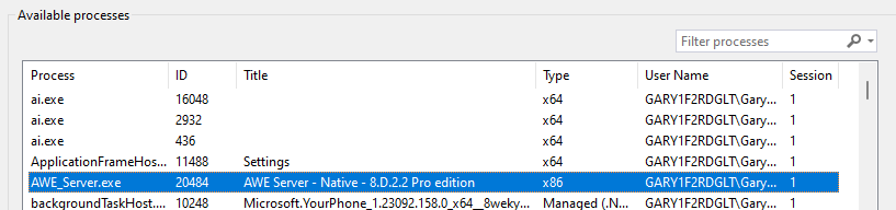 Choose “AWE_Server.exe” from the list, then click on the “Attach” button.