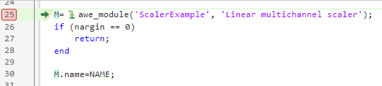 To add a breakpoint to your MATLAB code, click on the line number. Add a breakpoint on the “awe_module” instruction line.